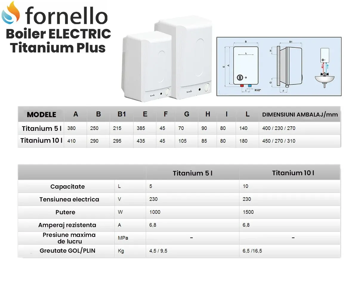 Boiler electric Fornello Titanium Plus 10 litri, montaj deasupra chiuvetei, reglaj extern de temperatură, 1500 w