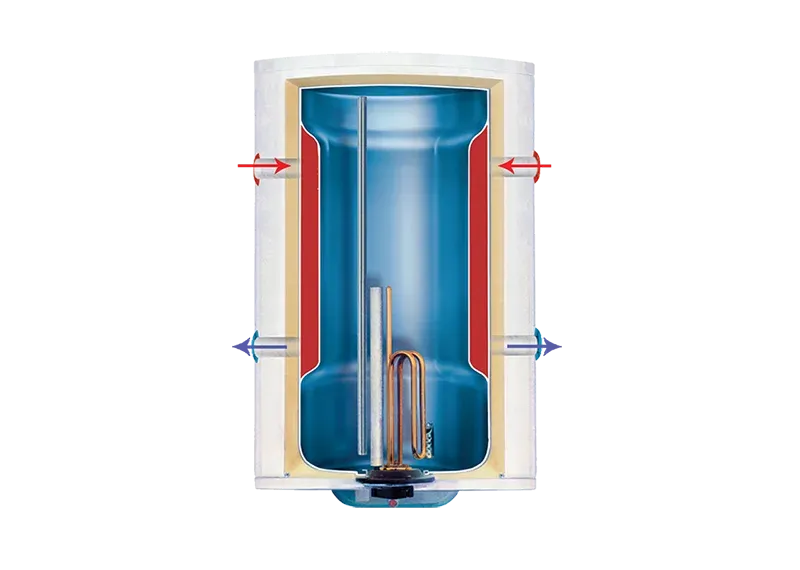 Rezervorul interior conține fluidul care trebuie încălzit (circuitul secundar), iar rezervorul exterior conține fluidul încălzitor (circuitul primar).