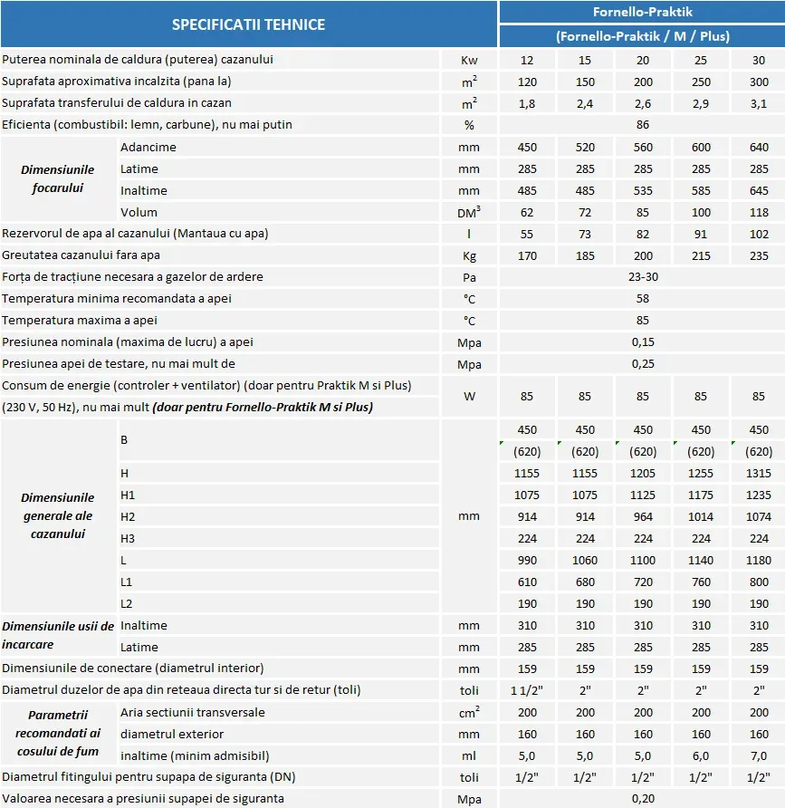 Caracteristicile tehnice si dimensiunile generale ale cazanului Fornello Praktik / Praktik M / Praktik Plus