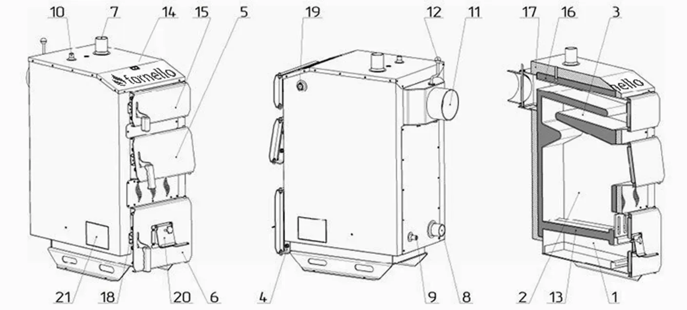 Elementele cazanului pe combustibil solid Fornello Praktik: