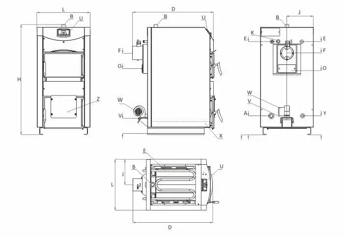 - Flanşă pe uşa inferioară pentru montarea unui arzător pe peleţi, gaz sau motorina (opţional).